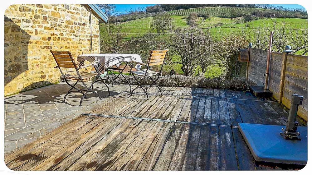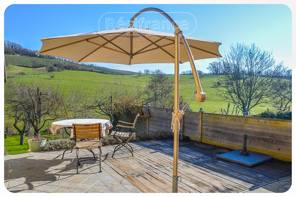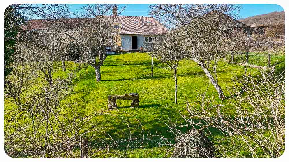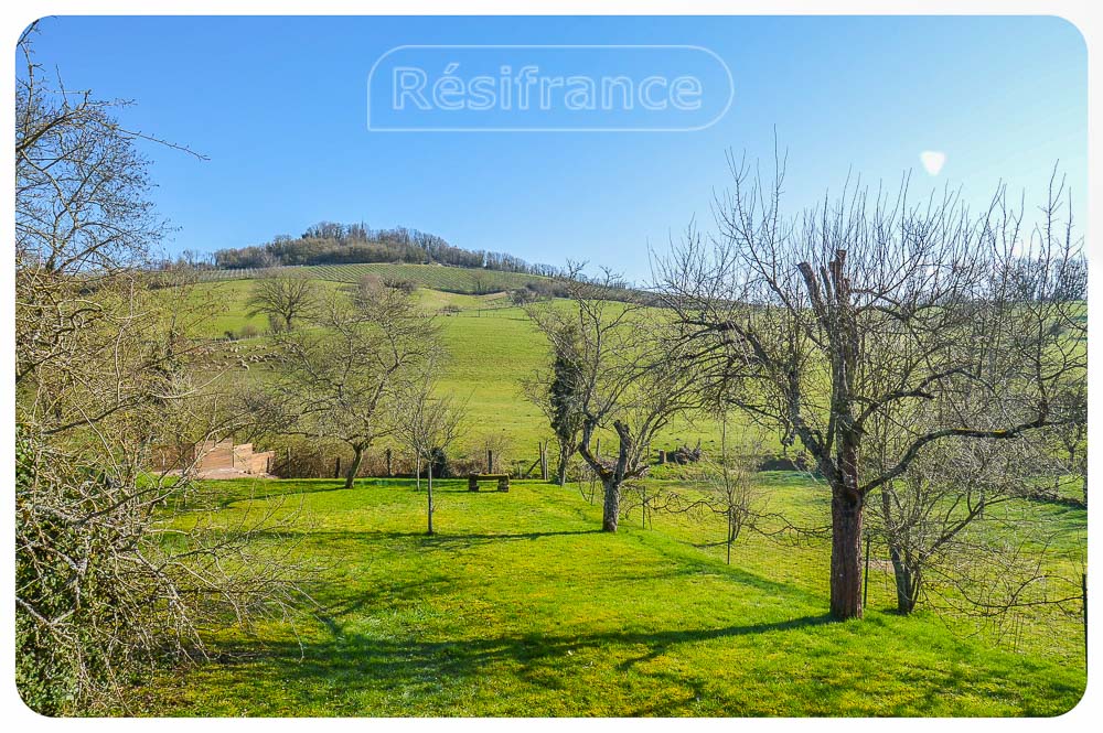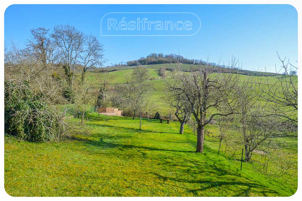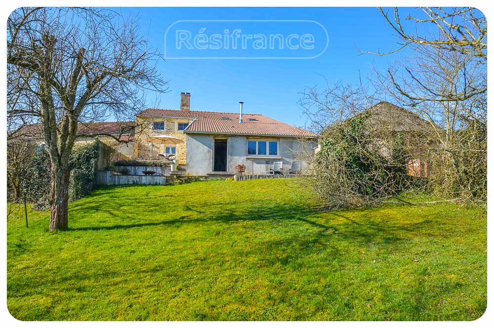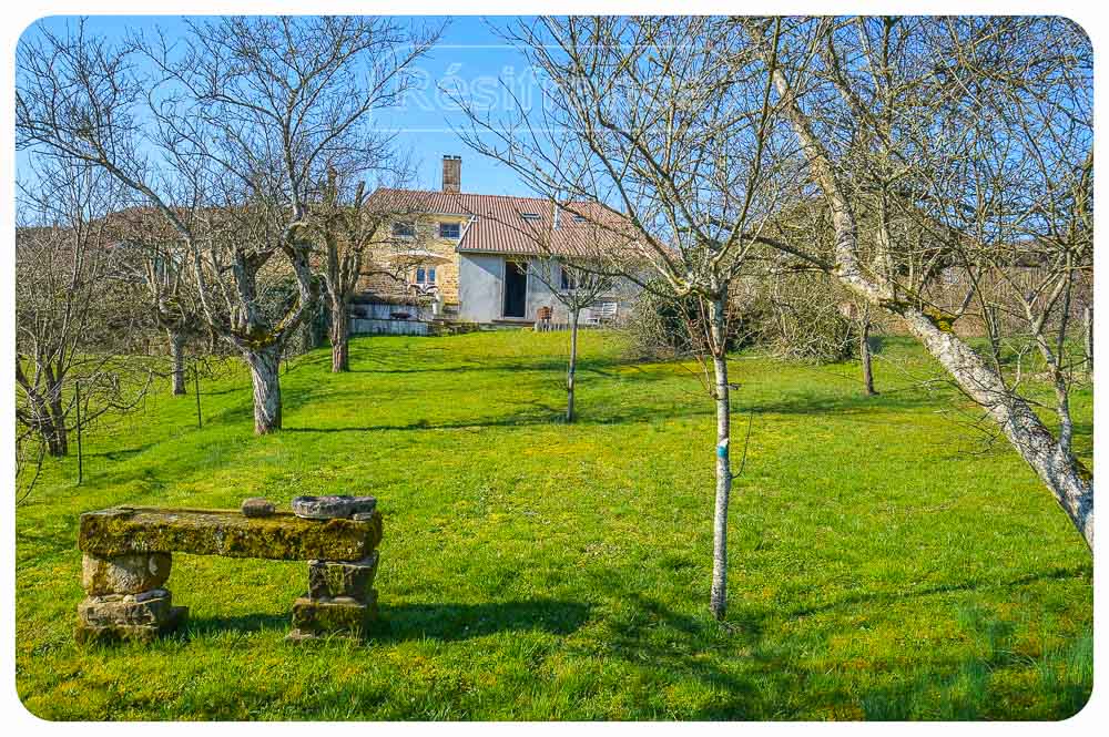 Het huis is half vrijstaand met een ruime tuin aan voorzijde en achterzijde van het huis, met ruim terras, fruitbomen en schitterend uitzicht over de heuvels en bossen. Aan het einde van de tuin loopt een klein beekje. Het totale oppervlak van het terrein bedraagt 802 m²